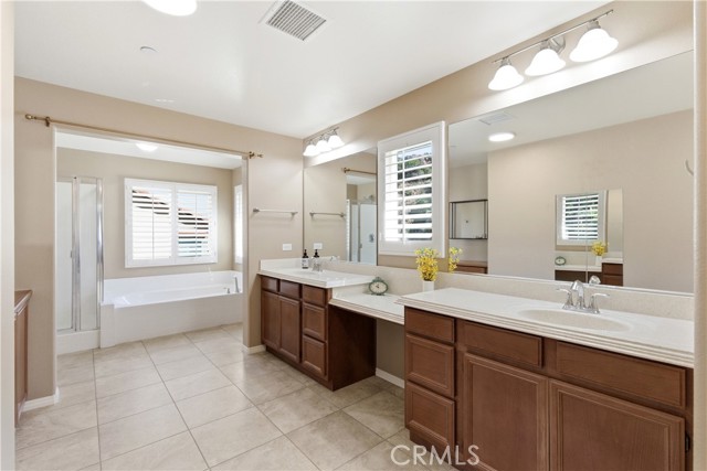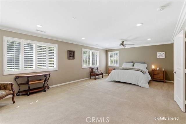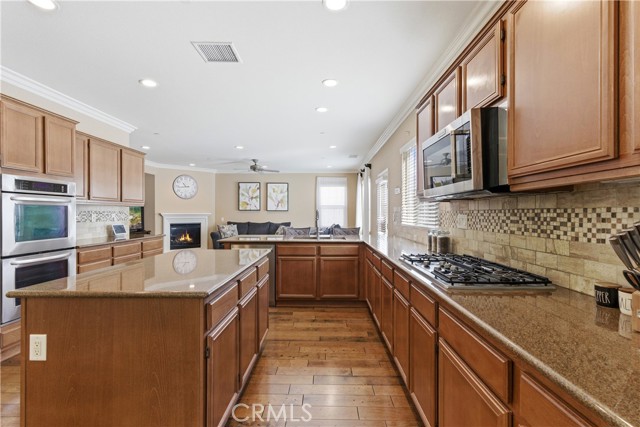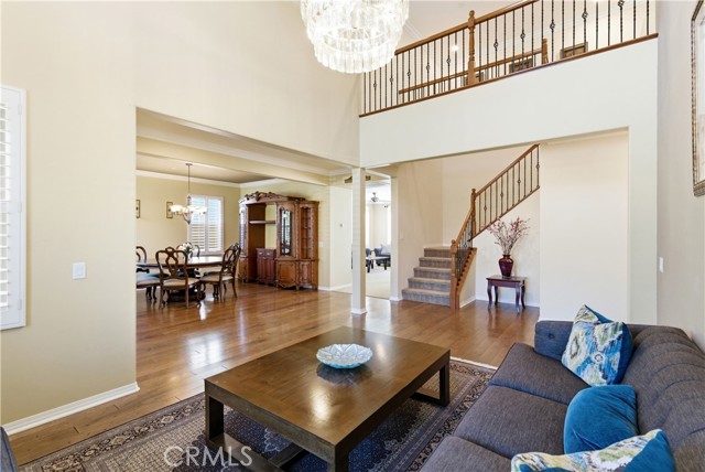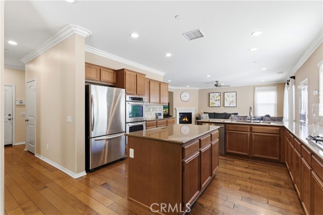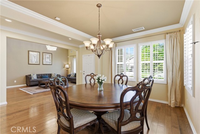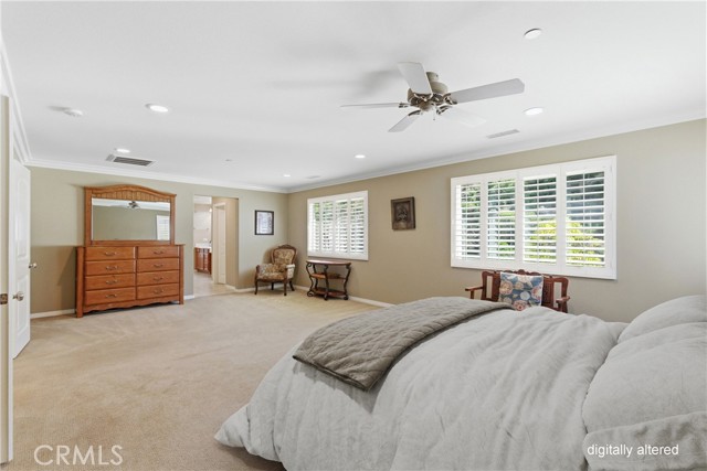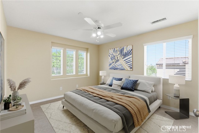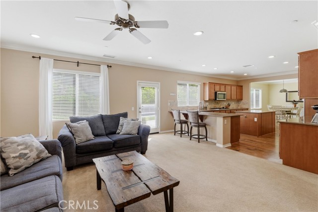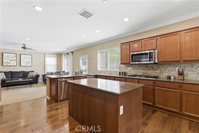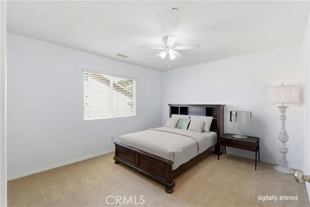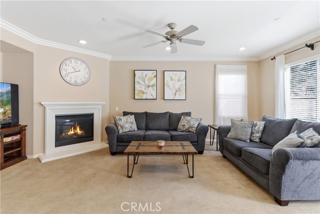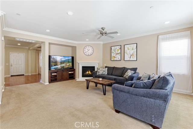 Beautiful, upgraded home in one of South Corona’s most sought-after neighborhoods! Tucked in the hills of the Orchard Glen community, this meticulously maintained home delivers a bright, flexible floor plan complete with a downstairs bedroom suite, upstairs living area, and a private backyard with gorgeous hillside views with no rear neighbor. Lush front lawns give way to a two-car garage and a charming covered entry. Inside, the main level opens to a soaring two-story living room and a large formal dining room, all swimming in natural light. Upgrades throughout include designer tile and hardwood floors, plantation shutters, and iron balusters on the stairs and landing. The open family room and kitchen form the heart of the home, with a cozy corner fireplace and a breakfast bar for casual meals. An exterior door opens directly to the patio, creating an easy flow between indoor and outdoor living. Home chefs will adore the kitchen’s generous granite countertops and hardwood cabinets providing ample storage, complemented by a suite of stainless steel appliances, tile backsplash, and a center island. An adjacent eat-in dining area offers more flexibility for hosting, homework, and everything in between. A main-level bedroom and full bath provide a true guest suite or multi-generational option. Upstairs, the oversized primary suite has room for a sitting area and includes a huge walk-in closet. The primary bath offers double vanities, soaking tub, and a separate shower. Two additional bedrooms share a full bath with double sinks, and every bedroom has plush carpeting and a ceiling fan for year-round comfort. A large loft living room adds versatile space for a media room, play area, or creating a fifth bedroom, and the laundry room is conveniently located on this level as well. Outside, a large sunny patio and lawn are framed by manicured hedges and privacy walls, creating a secluded space to take in the views. A side yard with gate access connects to the front. The home also includes a water softener system. From this great location, you’re only moments away from popular trails in the Skyline hiking area, with local restaurants, shopping, and easy access to the 241 toll roads and Orange County all a short drive away. Meticulously maintained and move-in ready, this is a home that checks every box!