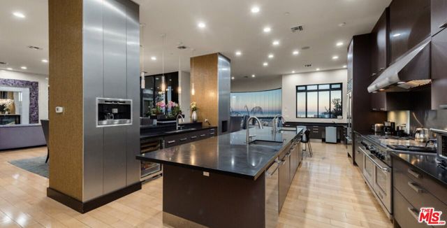 Nestled on a rare corner lot in one of Brentwood's most private canyon enclaves, 1799 Correa Way offers a true estate compound with unobstructed panoramic views stretching from the Pacific Ocean and Catalina Island to the Downtown Los Angeles skyline. Set behind gates with no immediate neighbors, the property delivers exceptional privacy and scale, anchored by a dramatic main residence defined by floor-to-ceiling glass walls that fully capture the surrounding canyon and city vistas. Indoor-outdoor flow is seamless, with expansive sliding doors opening to multiple terraces designed to maximize light, views, and entertaining. The main home features a functional layout with a gourmet kitchen, oversized island, and breakfast area, along with a main-level bedroom and three additional bedrooms upstairs. The primary suite is positioned to take full advantage of the views, complete with a private wraparound balcony, fireplace, and spa-style bath with soaking tub and steam shower. A key differentiator is the approximately 3,200+ square foot detached studio/workspace with guest accommodations (a 4 bedroom Guest house), creating a rare multi-structure compound ideal for creative use, extended living, or high-end guest quarter San asset not commonly found in this pocket of Brentwood. The grounds are designed for resort-style living, featuring a black-bottom pool, spa, water features, outdoor kitchen, fire pit, and multiple entertaining areas, all set within lush, secluded landscaping. Located minutes from Brentwood's top dining, retail, and schools, this property combines privacy, view, and compound flexibility offering a unique opportunity to reposition or customize a premier canyon estate.