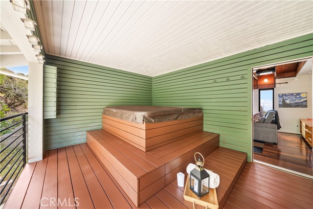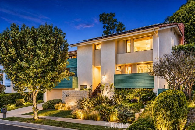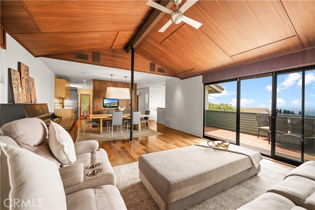 Welcome to your coastal sanctuary. Perched in one of Rancho Palos Verdes' most sought-after neighborhoods, this stunning Mid-Century Modern retreat at 30232 Via Borica delivers sweeping panoramic ocean and Catalina Island views that will take your breath away — every single day. This thoughtfully designed 4-bedroom + office, 4-bathroom home spans two levels, blending timeless architecture with luxurious modern upgrades. Rich Brazilian hardwood floors, soaring beamed ceilings, and custom designer tilework set the tone the moment you step inside. The open-concept living and dining areas flow effortlessly to an expansive ocean-view deck — the perfect stage for unforgettable sunsets and year-round entertaining. The chef's kitchen is a showstopper, featuring a 6-burner commercial-grade range, double convection oven, butcher block and granite countertops, and premium stainless appliances. Step outside to your private heated Jacuzzi spa, surrounded by lush, landscaped grounds — your own backyard oasis. Retreat to the primary suite, a true sanctuary complete with a private covered deck, spa-inspired bathroom with radiant heated floors, dual rain shower heads, and a walk-in shower. Three additional bedrooms on the main level offer flexibility for family, guests, or a dedicated home office. A home theater with retractable screen, a wine cellar, and a spacious bonus room — ideal as a gym, workshop, or studio — round out the home's impressive versatility. Additional highlights include: Fully paid-off solar system — energy savings from day one. Oversized 2.5-car garage with utility sink. Central A/C. Served by the prestigious Palos Verdes Peninsula Unified School District. No HOA fees. Turnkey, move-in ready, and priced to reflect the extraordinary lifestyle it offers. Moments from Point Vicente Elementary, scenic coastal trails, golf courses, and the best dining and shopping the peninsula has to offer. This is not just a home — it's a front-row seat to the Pacific.