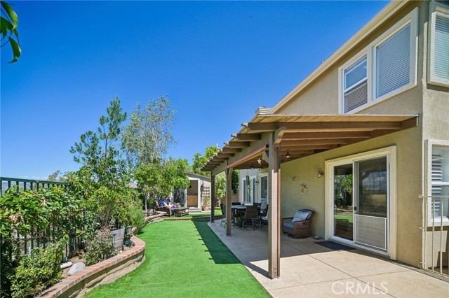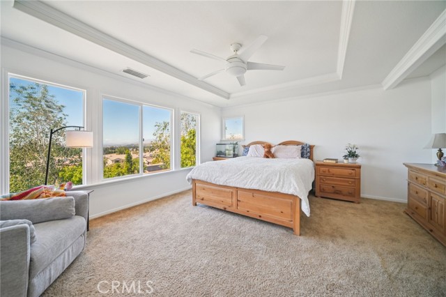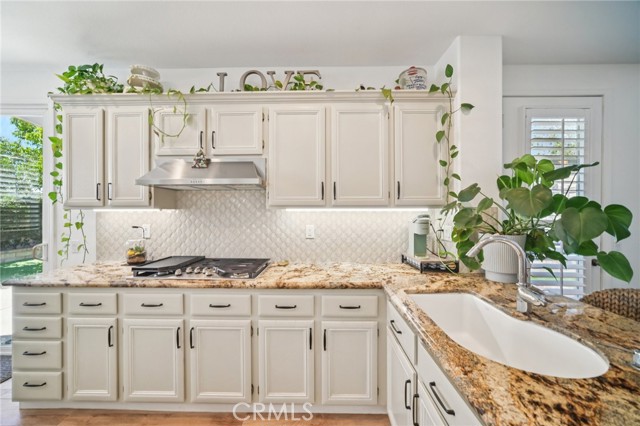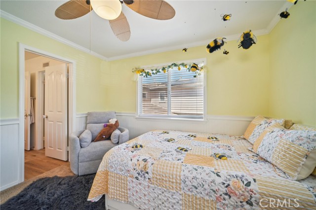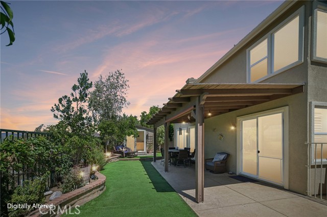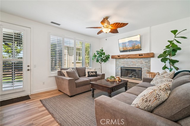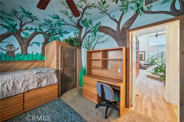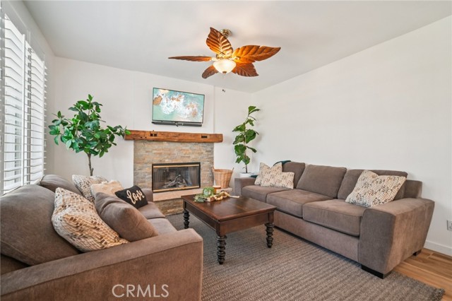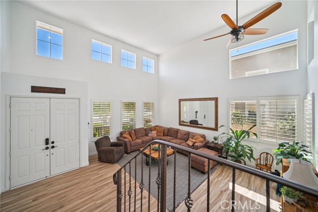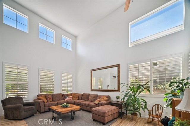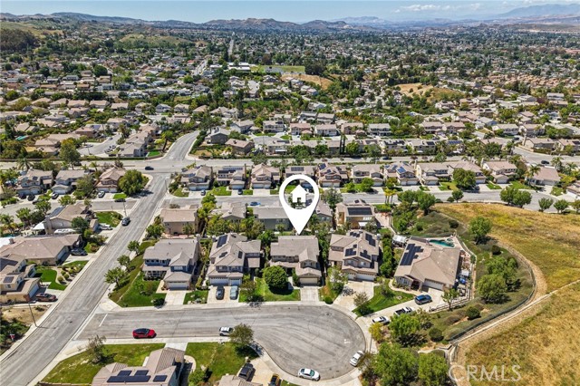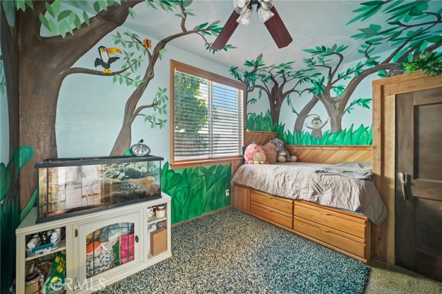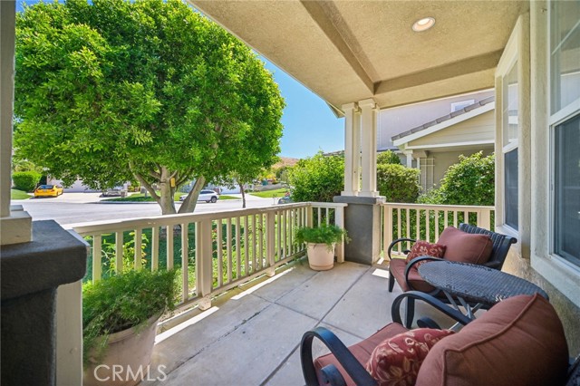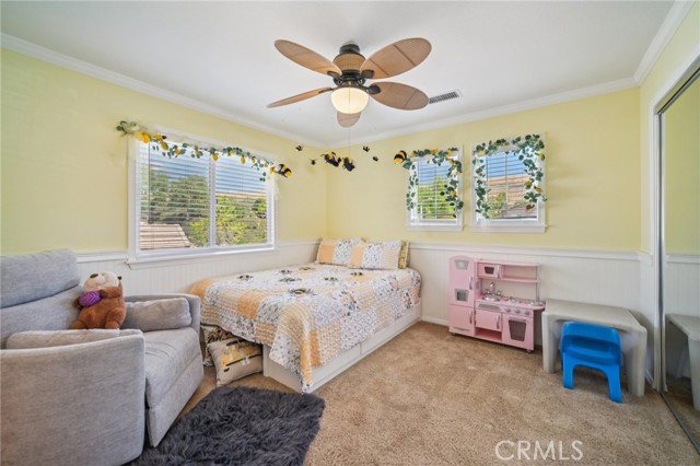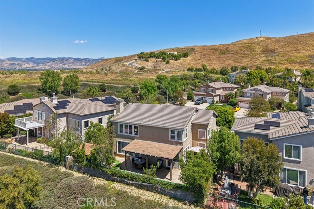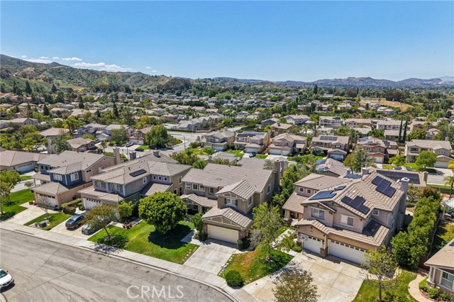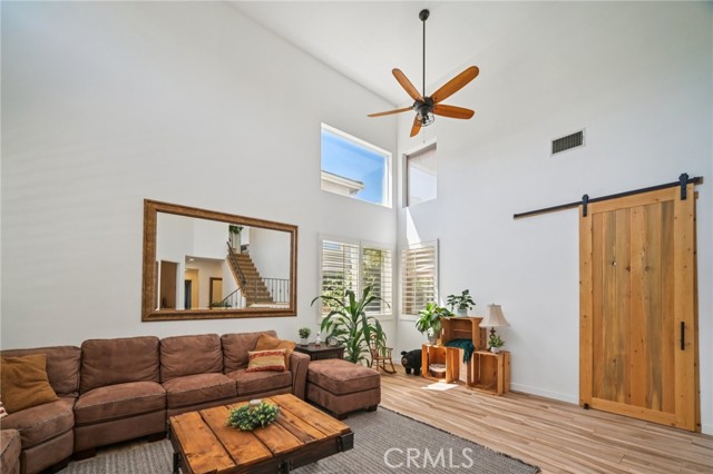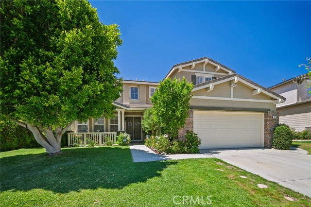 Tucked at the end of a cul-de-sac in Simi Valley, this beautifully maintained view home features 4 bedrooms plus an optional 5th bedroom and sweeping 180° city views. Built in 2001, the home welcomes you with a front porch seating area and a grand living room featuring soaring approximately 20 foot ceilings, abundant natural light, and a ceiling fan. The downstairs showcases tile flooring, plantation shutters, and a warm, inviting family room with a stacked stone fireplace and custom mantle. A barn door connects the living space to the kitchen, where you’ll find granite countertops, a center island, custom backsplash, stainless steel appliances, built in microwave, recessed lighting, a dining area, and a separate breakfast bar seating area for added function and everyday gathering. A standout feature of the home is its versatile floor plan, which includes a downstairs bedroom plus an additional downstairs bonus room currently used as a bedroom, ideal for guests, a home office, den, playroom, or flex space. A full downstairs bath offers a walk in shower, granite countertops, and custom tile work. Upstairs, custom wrought iron stair rails lead to spacious secondary bedrooms, a Jack and Jill bath with dual sinks, a separate laundry room with built in cabinetry, and a private primary suite with double door entry, ceiling fan, breathtaking sunset views, two large walk in closets, separate vanities, walk in shower, and a jetted soaking tub positioned to take in the scenery. The backyard is designed for both relaxation and utility, with stamped concrete, a covered patio with lighting, artificial turf, and a finished shed currently used as a craft room complete with carpeting, built in cabinetry, granite countertop, recessed lighting, and windows. It also makes an excellent studio, office, hobby room, or creative retreat. Additional highlights include dual pane windows and doors, ceiling fans in almost every room, and an attached 2 car garage with roll up door. A rare opportunity to own a versatile view property in a desirable Simi Valley location.
