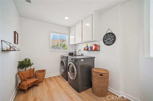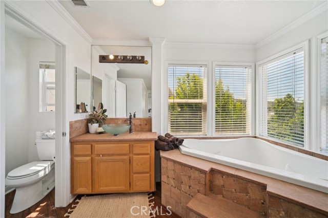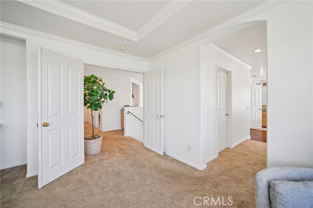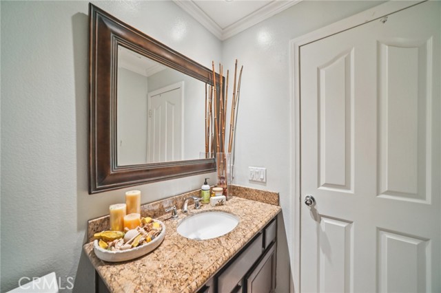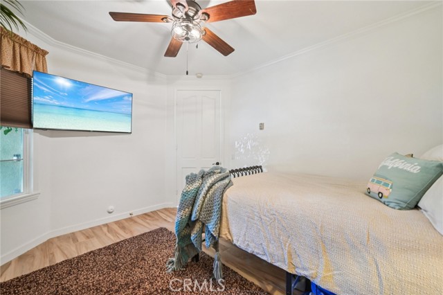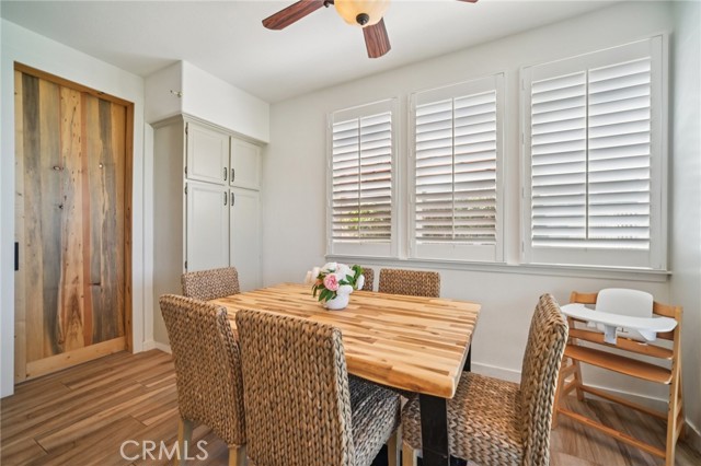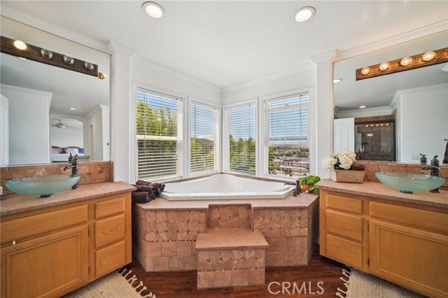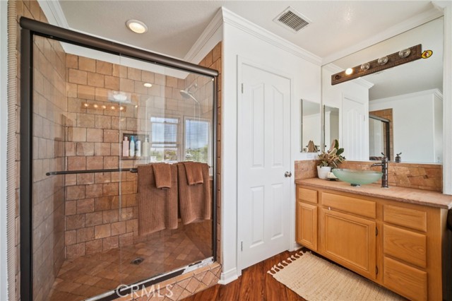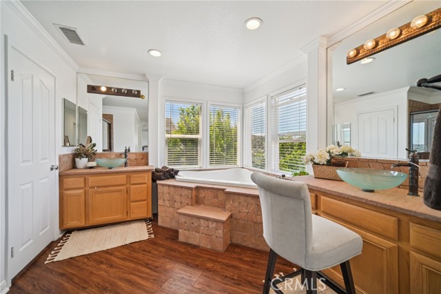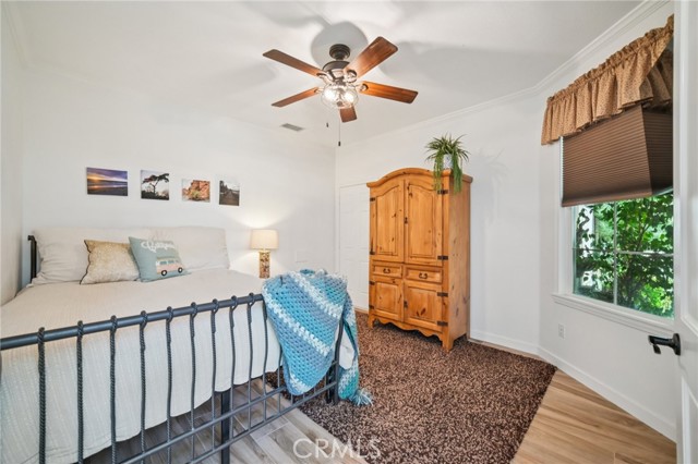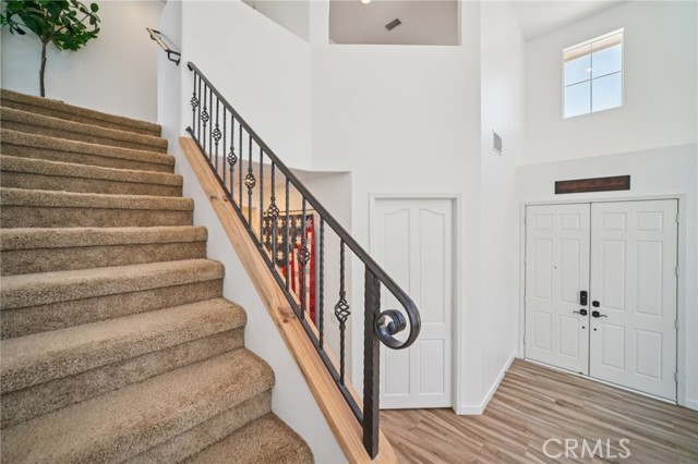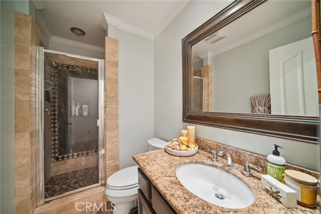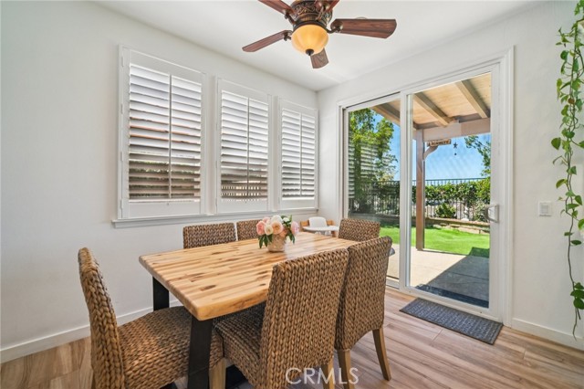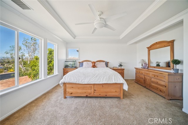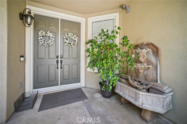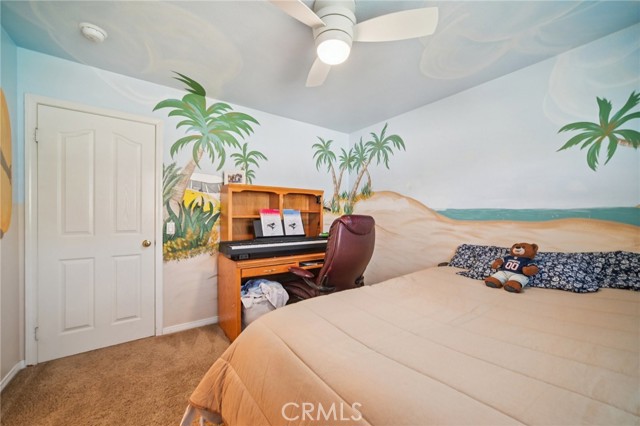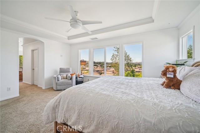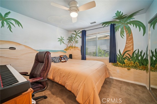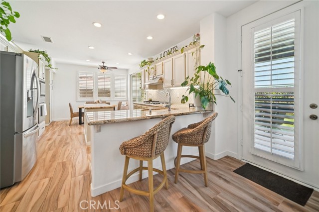 Tucked at the end of a cul-de-sac in Simi Valley, this beautifully maintained view home features 4 bedrooms plus an optional 5th bedroom and sweeping 180° city views. Built in 2001, the home welcomes you with a front porch seating area and a grand living room featuring soaring approximately 20 foot ceilings, abundant natural light, and a ceiling fan. The downstairs showcases tile flooring, plantation shutters, and a warm, inviting family room with a stacked stone fireplace and custom mantle. A barn door connects the living space to the kitchen, where you’ll find granite countertops, a center island, custom backsplash, stainless steel appliances, built in microwave, recessed lighting, a dining area, and a separate breakfast bar seating area for added function and everyday gathering. A standout feature of the home is its versatile floor plan, which includes a downstairs bedroom plus an additional downstairs bonus room currently used as a bedroom, ideal for guests, a home office, den, playroom, or flex space. A full downstairs bath offers a walk in shower, granite countertops, and custom tile work. Upstairs, custom wrought iron stair rails lead to spacious secondary bedrooms, a Jack and Jill bath with dual sinks, a separate laundry room with built in cabinetry, and a private primary suite with double door entry, ceiling fan, breathtaking sunset views, two large walk in closets, separate vanities, walk in shower, and a jetted soaking tub positioned to take in the scenery. The backyard is designed for both relaxation and utility, with stamped concrete, a covered patio with lighting, artificial turf, and a finished shed currently used as a craft room complete with carpeting, built in cabinetry, granite countertop, recessed lighting, and windows. It also makes an excellent studio, office, hobby room, or creative retreat. Additional highlights include dual pane windows and doors, ceiling fans in almost every room, and an attached 2 car garage with roll up door. A rare opportunity to own a versatile view property in a desirable Simi Valley location.