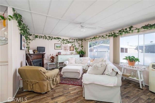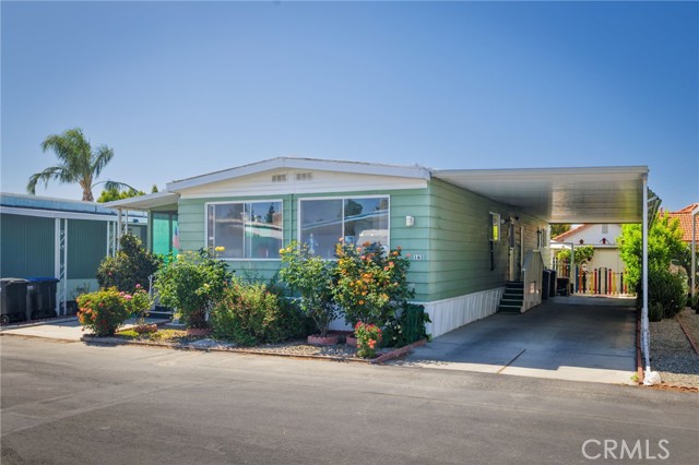 2-bedroom, 2-bath home located at 725 W Thornton Ave #163 in a senior community in Hemet. This home features a functional floor plan with a living area, kitchen with cabinet storage and counter space, and designated dining area. The primary bedroom includes an attached bathroom, with a second bedroom and additional full bathroom. Exterior includes a private outdoor space. Property is situated within a senior community with access to nearby shopping, dining, and local amenities.