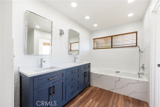 Welcome to this beautifully updated home in the highly sought-after Mesa Verde community of Costa Mesa. This light-filled 2-bedroom, 2.5-bath residence offers approximately 1,757 sq ft of thoughtfully designed living space, blending modern upgrades with a relaxed, coastal-inspired aesthetic. Step through an oversized entry door into a bright, open-concept living and dining area designed for comfortable everyday living and effortless entertaining. The remodeled kitchen features sleek quartz waterfall countertops, stainless steel appliances, abundant cabinetry, recessed lighting, and a charming breakfast nook that opens to the private patio. Enjoy seamless indoor-outdoor living in the fully enclosed patio space backing to a lush greenbelt—perfect for relaxing or hosting guests. Upstairs features a spacious primary suite and a secondary en-suite bedroom, both with walk-in closets. The primary suite offers a cozy fireplace, private balcony, and a beautifully remodeled bathroom with dual vanities, soaking tub, and separate walk-in shower. The secondary suite offers flexibility for guests, a home office, or additional living needs. Recent upgrades include new windows, central A/C, smooth-finish walls, recessed lighting throughout, refreshed bedroom spaces, a redesigned upstairs laundry area with brand-new washer and dryer, and tastefully renovated bathrooms with clean, modern finishes. The attached garage features epoxy flooring, an electric vehicle charger, and parking for two vehicles, plus two additional driveway spaces. Residents enjoy community pool and spa amenities. Ideally located near shopping, dining, golf courses, and just minutes from the beach—this is Mesa Verde living at its finest.
