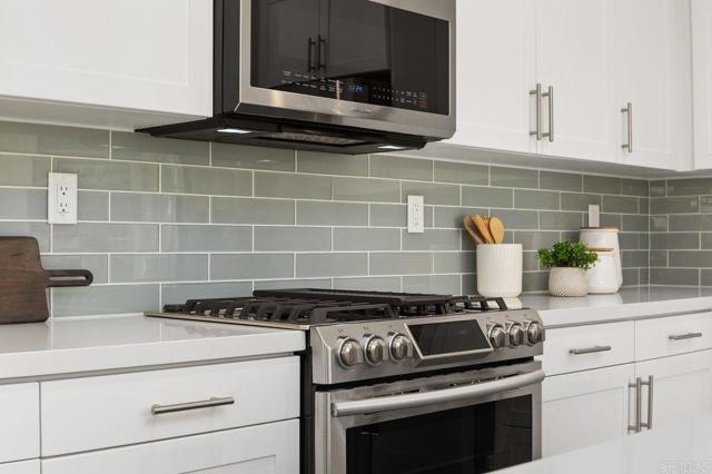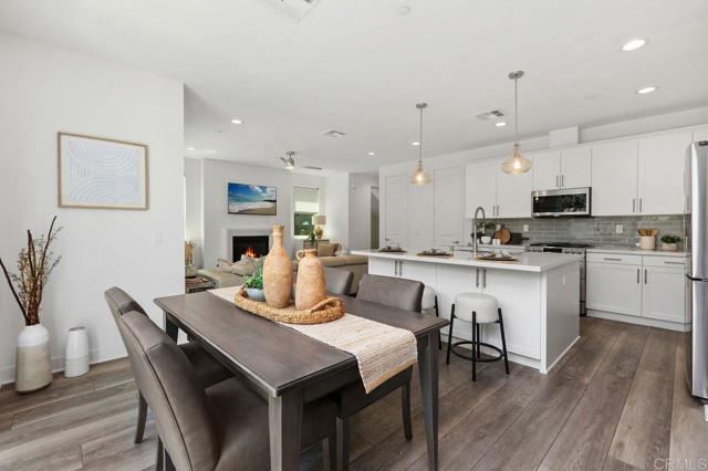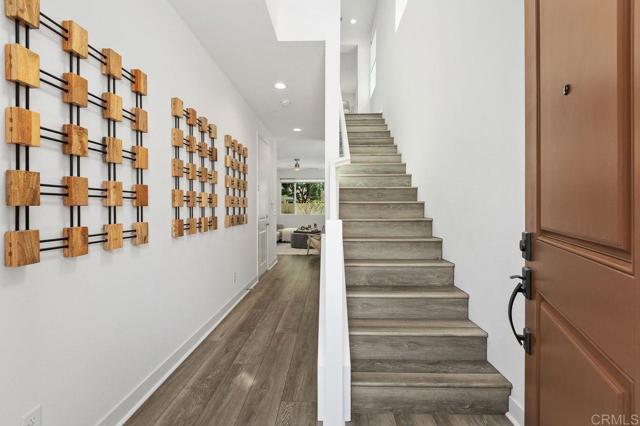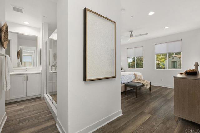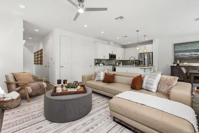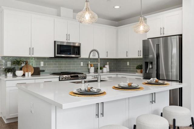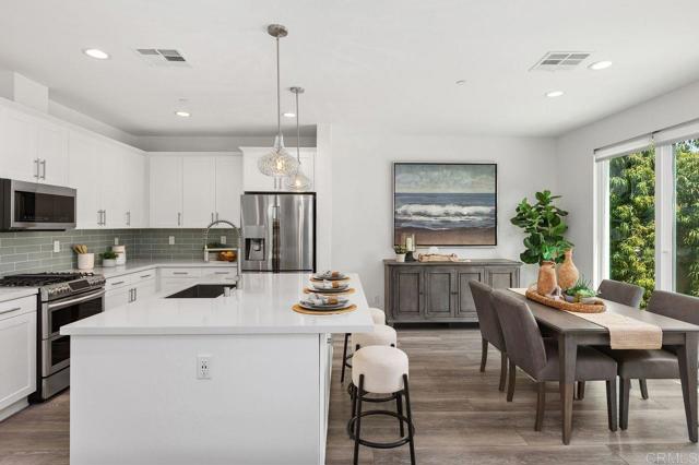 Nestled within the highly desirable Preserve community just miles from Carlsbad State Beach, this exceptional home offers the perfect blend of modern luxury and natural serenity. Ideally located within walking distance to shopping, dining, and transportation, it delivers both convenience and an elevated lifestyle. Step inside to an expansive open-concept floor plan that seamlessly blends sophistication with high-end, functional design. The chef-inspired kitchen is a true centerpiece, featuring striking white shaker cabinetry, a sophisticated glass backsplash, wide-plank wood-look flooring, and premium stainless steel appliances—including a five-burner gas stove. An oversized center island with a large single-basin sink, pull-down faucet, and custom glass-blown pendant lighting is complemented by timeless light-toned quartz countertops. The kitchen flows effortlessly into the inviting family room, where a cozy fireplace creates the perfect gathering space. Expansive sliding glass doors open to your private backyard oasis, complete with elegant custom pavers, lush tropical landscaping, ambient lighting, and a calming water feature—ideal for relaxing or entertaining. Upstairs, the home continues to impress with three bedrooms and a versatile loft featuring abundant natural light, a custom ceiling fan, and direct access to a private balcony. The thoughtfully designed primary suite offers a peaceful retreat, privately situated away from the secondary bedrooms. Enjoy direct balcony access, custom ceiling fan, a spa-inspired ensuite with dual vanities, an expansive walk-in shower, and a spacious walk-in closet. The two secondary bedrooms offer large closet space and ample natural lighting. A conveniently located upstairs laundry room includes a utility sink and additional white shaker cabinetry. The garage is equally refined, featuring epoxy flooring, custom built-in cabinetry, and functional storage solutions. Residents of The Preserve enjoy resort-style amenities, including a beach-entry pool, lap lanes, spa, BBQ area, outdoor fireplace lounge, fitness center, gated dog park, playgrounds, scenic park areas, and miles of hiking trails—all surrounded by 156 acres of preserved open space. Located within the top-rated Carlsbad Unified School District, this is more than just a home—it’s the lifestyle you’ve been waiting for.