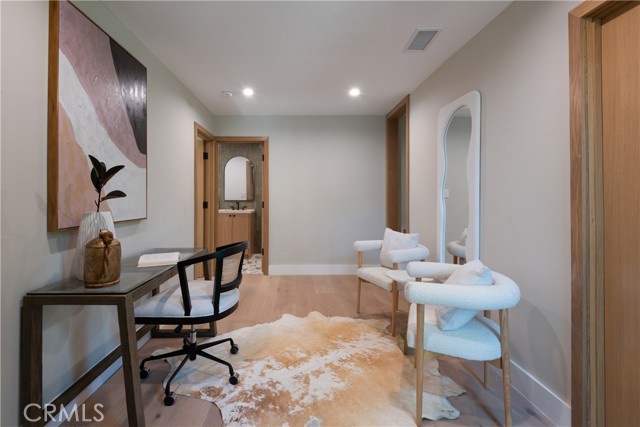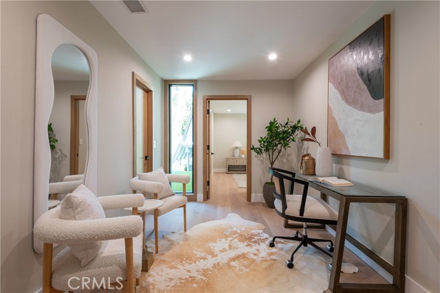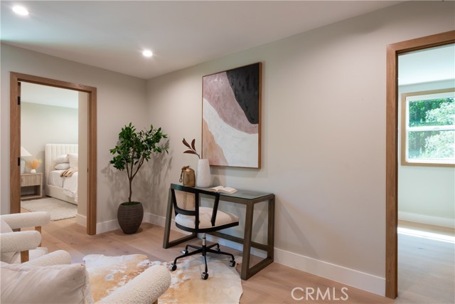 Privately set south of the Boulevard in a coveted Studio City pocket, this reimagined mid-century home offers rare peace and privacy just minutes from premier shopping and dining. The 3-bedroom, 2.5-bath residence with additional office features warm cedar and stone accents, herringbone wood floors, custom millwork, and light-filled open living spaces designed for effortless flow. The chef’s kitchen showcases white oak cabinetry, Viola Monet Calacatta marble, and paneled appliances, opening to a private patio with built-in grill. Upstairs, the serene primary suite includes expansive windows, custom closets, and a spa-inspired bath with soaking tub and walk-in shower. Additional bedrooms and a flexible den provide versatility. Close to hiking trails, Sportsmen’s Lodge, Erewhon, Equinox, and top Studio City amenities, this home offers a quiet, refined retreat in a prime location.