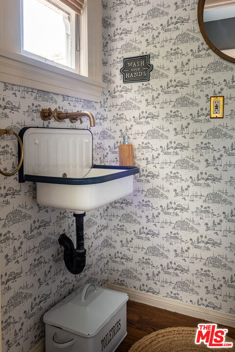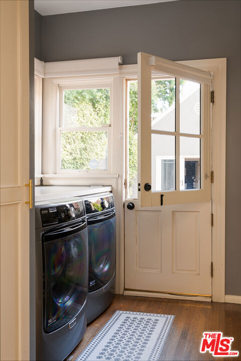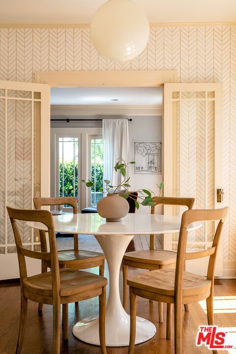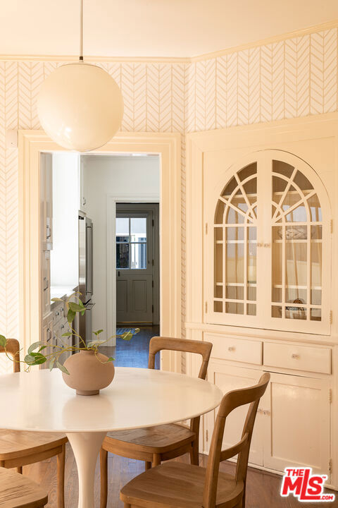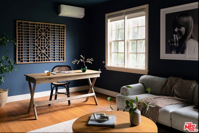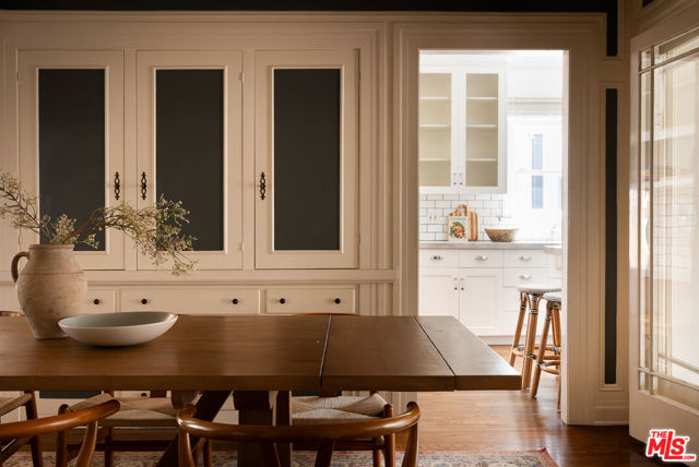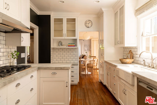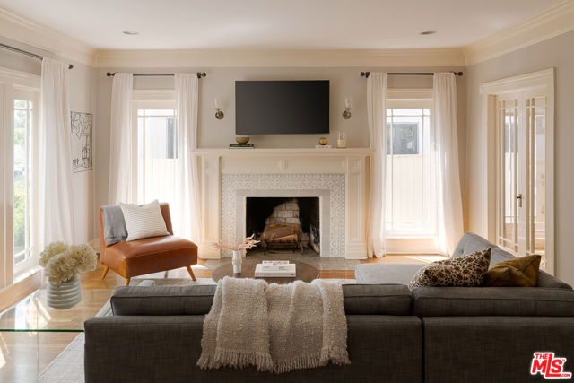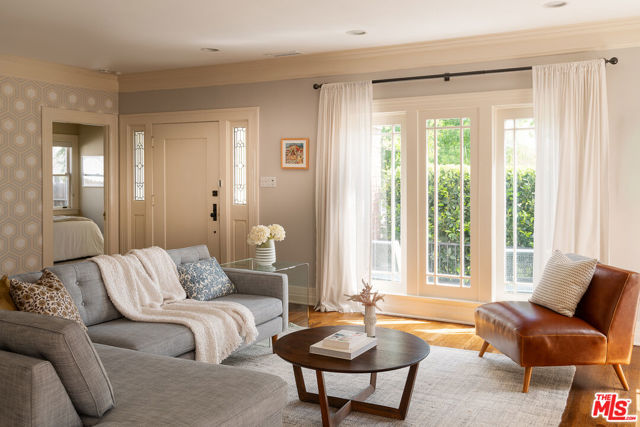 A graceful reinvention of classic English Country style in the heart of Larchmont Village, this exceptional 1920s residence blends timeless architecture with thoughtful modern updates. Rich in character and exquisite detail, the home offers effortless single-level living with seamless indoor-outdoor flow. The expansive living room features a custom-tiled fireplace, while the renovated chef's kitchen boasts a breakfast bar, built-in desk, and designer finishes. A formal dining room and charming breakfast room with classic built-ins provide inviting spaces for both everyday living and entertaining. A separate laundry room and beautifully styled powder room offer direct access to the stunning backyard. Two generously sized guest bedrooms, each with its own bath, are thoughtfully positioned for privacy, separate from the primary suite. The open-beamed family room and expanded primary retreat complete with a spacious walk-in closet and luxurious bath overlook the terrace, lush lawn, and gardens. Completing the property is a newer detached guest house with wood-beamed ceilings, loft space, custom built-ins, and a private bath ideal for guests, a sophisticated home office, or playroom. The expansive grounds offer ample room for a pool, presenting endless possibilities at this truly unforgettable Larchmont residence.