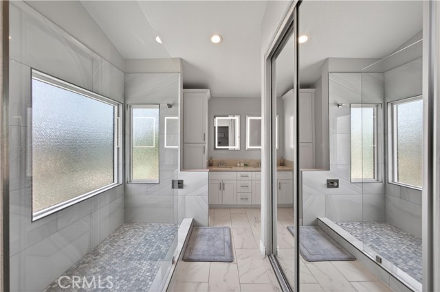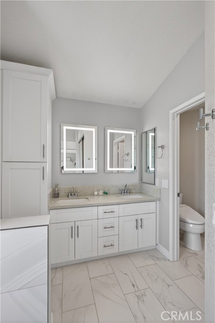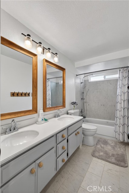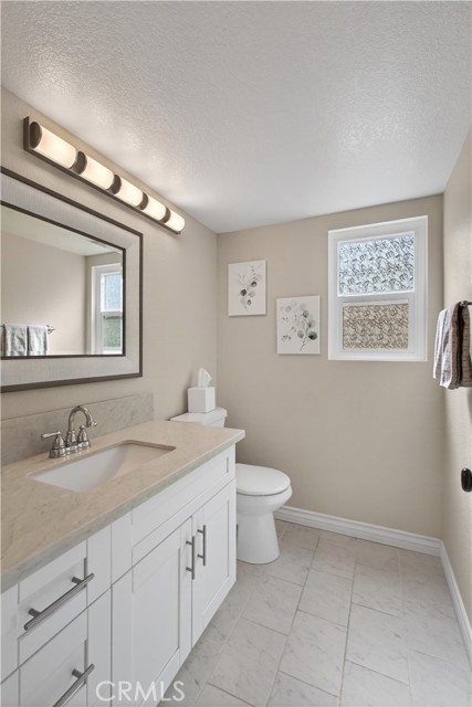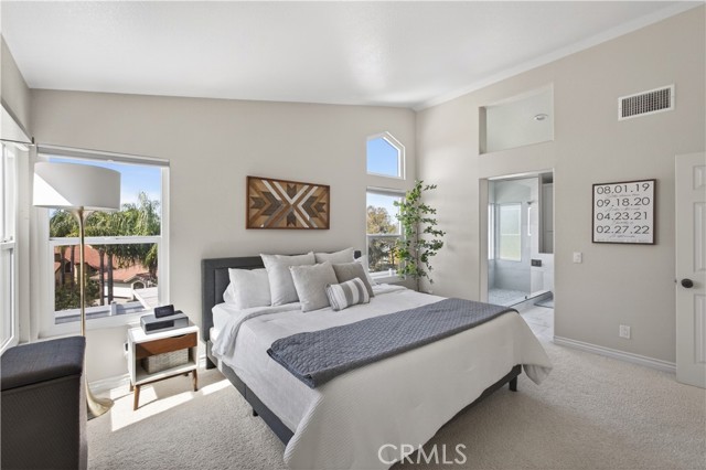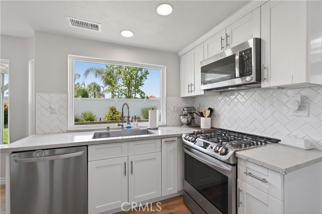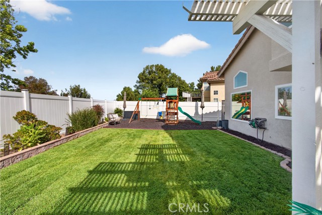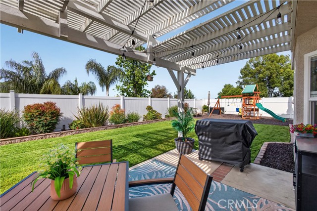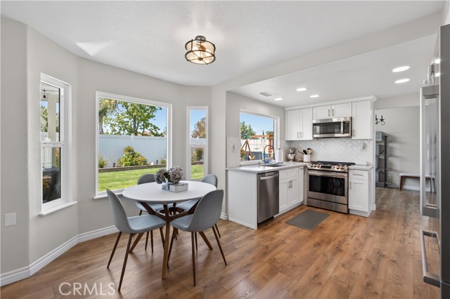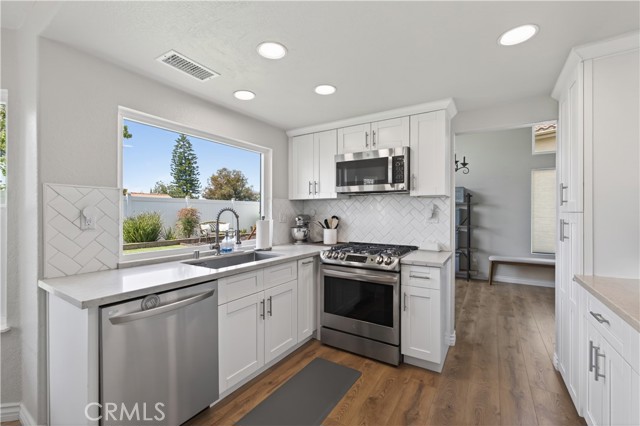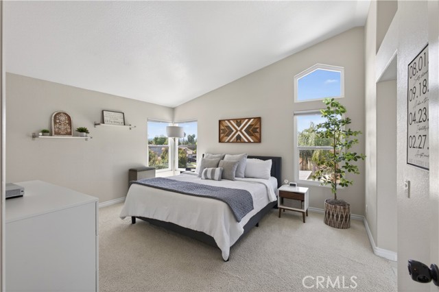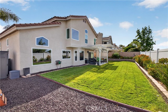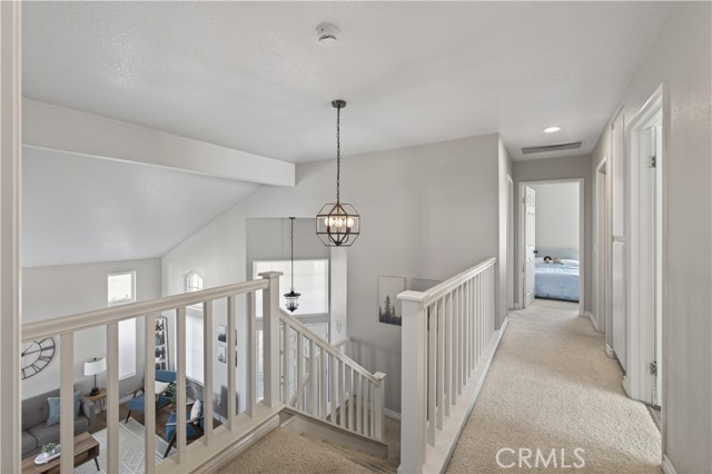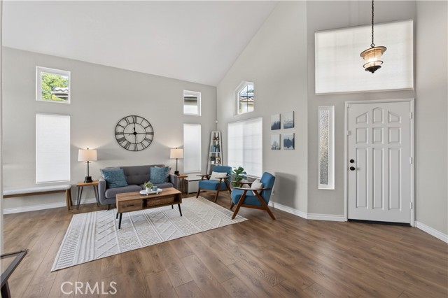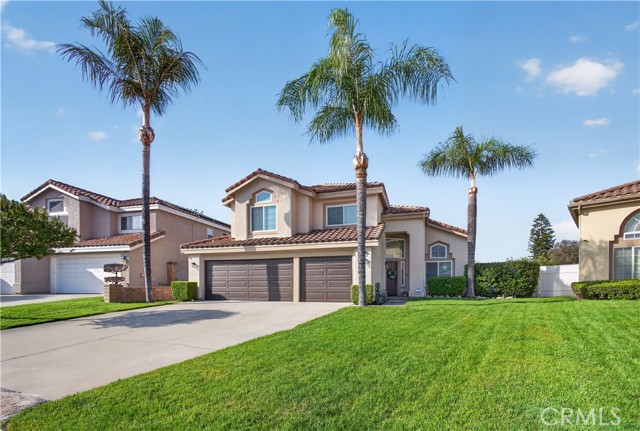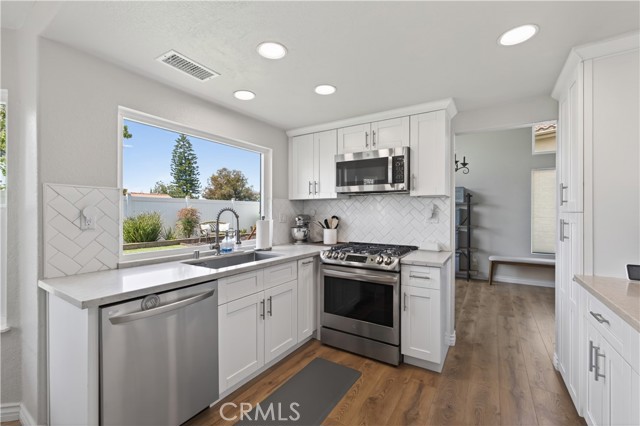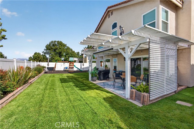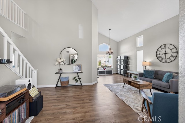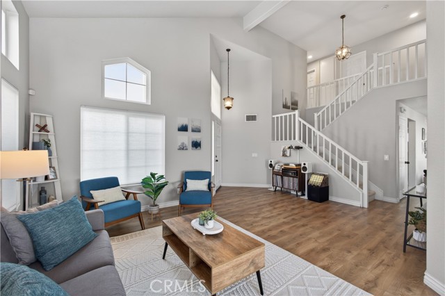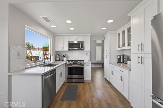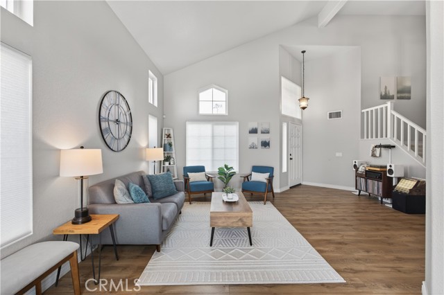 Beautifully updated East Highlands Ranch home with 4 bedrooms, 3 bathrooms, a 3-car garage, and no rear neighbors. Light, bright, and airy throughout, this home features a grand open living and dining room with vaulted ceilings and wood-look plank flooring downstairs. The remodeled kitchen offers white shaker cabinets, quartz countertops, stainless steel appliances, and a microwave/convection combo oven for the convenience of two ovens. The downstairs bathroom has been upgraded with matching white shaker cabinets and quartz counters. Upstairs features carpet in the bedrooms and tile in the bathrooms. The spacious primary suite offers vaulted ceilings, a large walk-in closet, and a beautifully renovated bath with white shaker cabinetry, quartz counters, and an oversized custom walk-in shower. Recent upgrades include replaced AC and heat, a whole house fan, and a whole home air filtration system installed as part of the HVAC upgrade. The home also features high-quality Ameristar windows and slider, including thicker glass in the primary bedroom for added noise reduction, plus two EV charging ports in the 3-car garage. Enjoy a private, fully landscaped backyard with new vinyl fencing, a playground, and no rear neighbors. Located in the desirable East Highlands Ranch community with lake, pools, spas, pickleball, tennis, basketball, walking trails, and more. Situated within the sought-after Redlands Unified School District.