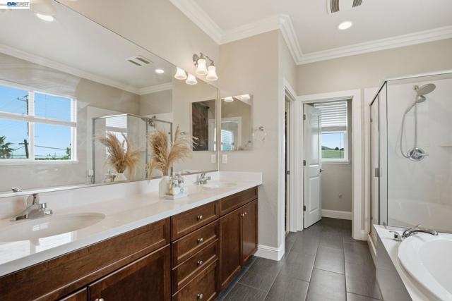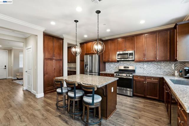 Welcome to 98 Driftwood Circle in Bay Point - a beautifully upgraded 4BD/2.5BA home built in 2017, ideally situated on a private corner lot with no rear neighbors and scenic Delta views. This light-filled home features an open-concept layout with high ceilings, recessed lighting, and seamless flow between living, dining, and kitchen spaces. The gourmet kitchen offers a large island, slab countertops, stainless steel appliances, decorative backsplash, and a walk-through pantry. A stylish wet bar adds the perfect touch for entertaining. Upstairs includes spacious bedrooms, a versatile layout, and a generous primary suite with walk-in closet and spa-like bath featuring dual vanities, soaking tub, and separate shower. Convenient upstairs laundry. Enjoy a low-maintenance backyard with stamped concrete patio and artificial turf, ideal for relaxing or hosting. Additional features include a 2-car garage with epoxy flooring, EV charger readiness, tankless water heater, and fire sprinkler system. Close to parks, BART, Bay Point Regional Shoreline, and Hwy 4. A perfect blend of comfort, style, and convenience.