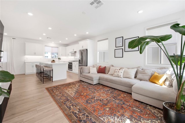 Welcome to 7370 Autumn Ave., a beautifully-crafted built in 2022 home located in the highly sought after master plan community of The Groves of Whittier. This impressive two-story home offers 4 bedrooms, 3 full bathrooms, and 2,207 square feet of thoughtfully designed living space, perfectly suited for families of all sizes and lifestyles. From the moment you step inside, you are greeted by a bright, open concept floor plan that effortlessly connects the living, dining, and kitchen areas, creating an inviting space for both casual gatherings and entertaining. The modern kitchen features stainless steel appliances, white soft close cabinetry, a walk-in pantry, and a large center island perfect for gathering. Soaring ceilings and an abundance of natural light elevate every corner of the home, while a main level bedroom and full bath offer ideal flexibility for guests or multigenerational living. Upstairs, the spacious primary suite serves as a true private retreat, complete with a large walk-in closet, soaking tub, separate walk-in shower, and dual sinks. A versatile loft provides the perfect flex space for a home office, playroom, or lounge. Two additional bedrooms, a full bath, and a dedicated laundry room complete the upper level. The home is packed with modern upgrades, including a whole-home water softener, reverse osmosis water filtration system for drinking water, leased solar panels, EV charging readiness in the attached two car garage, tankless water heater, smart home technology, LED recessed lighting, and central AC and heating, all designed for a comfortable and efficient lifestyle. The backyard features drip line irrigation, making outdoor upkeep a breeze. Meticulously maintained by its original owners, this home shows like a model and is truly move-in ready. As part of The Groves community, enjoy resort-style amenities including two sparkling pools, a spa, a Tudor-style clubhouse, fitness center, conference rooms, areas for remote work, WiFi, fire pit and BBQ lounges, a dog park, playground, putting green, bocce ball court, beautifully maintained walking paths, and the added peace of mind of a community night patrol. All of this just steps from Rodeo 72 Food Hall, Philz Coffee, Chipotle, Jersey Mikes, In N Out Burger, CAVA, EOS Fitness, Stater Bros., and convenient freeway access. Nearly new construction, modern finishes, premium upgrades, and an unbeatable community, 7370 Autumn Ave. truly has it all. Don't miss your chance to make it yours!