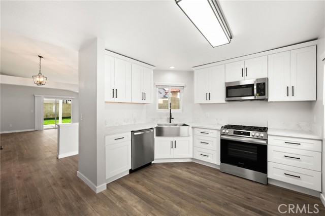 Welcome to this beautifully remodeled home in Highland, situated in a quiet neighborhood. Conveniently located near the 210 Freeway, it offers easy access to Redlands and surrounding areas. The interior and exterior have been freshly painted. The kitchen features brand-new cabinetry, quartz countertops, stainless steel appliances, a six-burner gas stove, a spacious pantry, a farmhouse sink, and plenty of room for meal preparation. The entryway leads to the dining and living rooms, both boasting vaulted ceilings and a cozy wood-burning fireplace. The primary bedroom includes a walk-in closet and a fully remodeled bathroom with a new shower over the tub. You'll also enjoy a two-car attached garage with laundry facilities, and the driveway has space for two full-size vehicles. The backyard features a large covered patio, fresh sod, and block walls for privacy. Additional amenities include a new AC and furnace, new window coverings, and a solar system to help keep utility bills low. Rent includes water, trash, and solar.