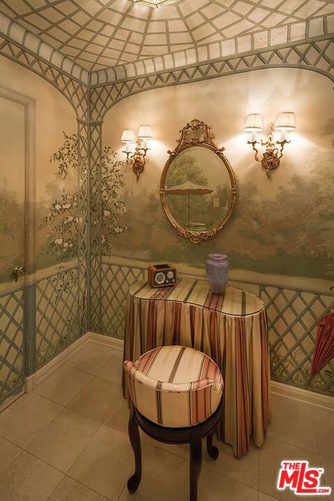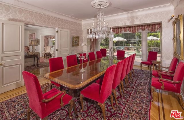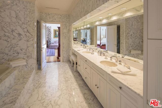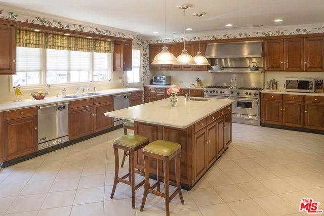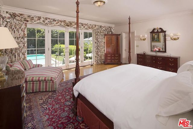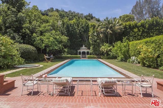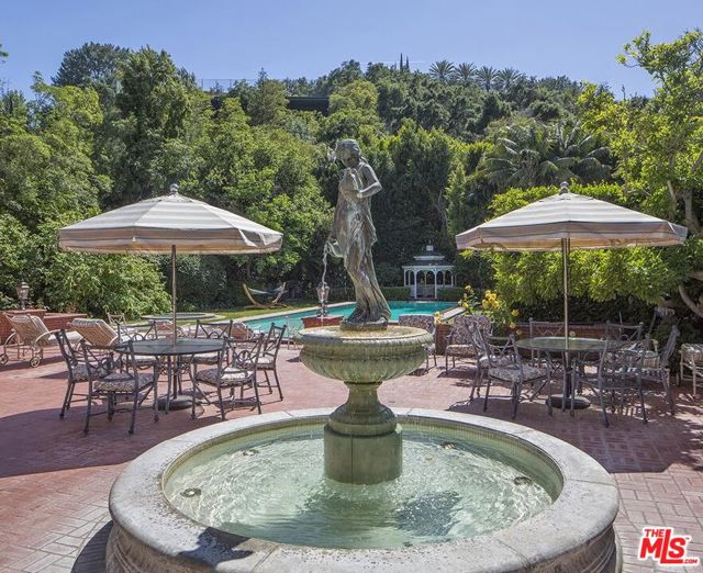 THE BEST FLAT ACRE IN BEL AIR !!!! From the welcoming splash of the fountain by the gated circular drive to the lushly landscaped backyard, this gracious residence offers abundant privacy and impeccable quality. On over one acre of flat land, its timeless beauty creates an ideal setting for peaceful living and indoor-outdoor entertaining. In the main house (5 bedrooms, 5 full, 2 half-baths, living, dining, island kitchen, family, office, breakfast, laundry), large rooms with parquet or tile floors and crown moldings look onto the yard's patio, pool and serene foliage. The family room invites parties with its built-in professional bar. The bedrooms, upstairs, include a master suite with all-marble bath and French doors. There are 4 fireplaces, 3 separate ensuite bedrooms in guest house, detached 3-car garage, 60-foot ionized pool, outdoor kitchen, and brick patio with fountain, portico and ample deck and lawn for lounging, dining and poolside entertaining.