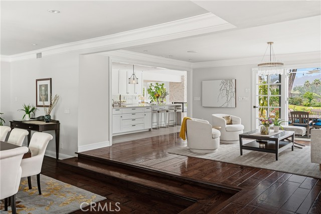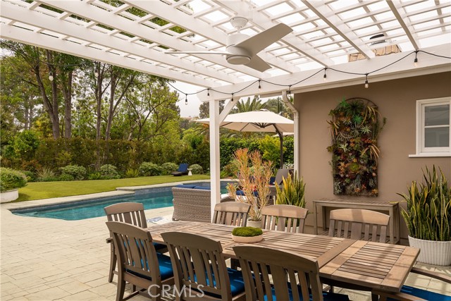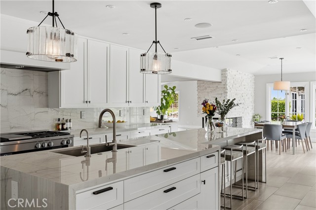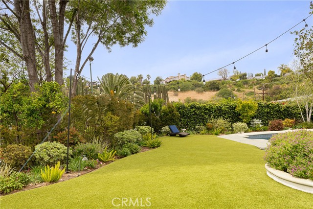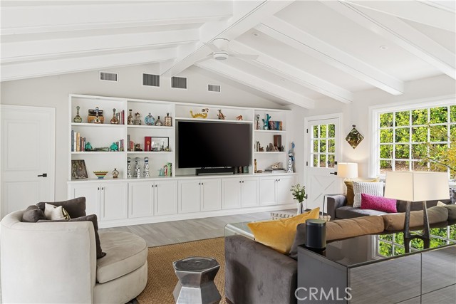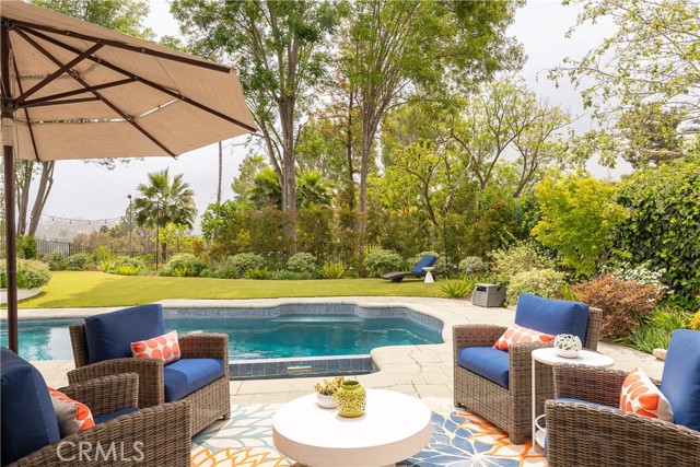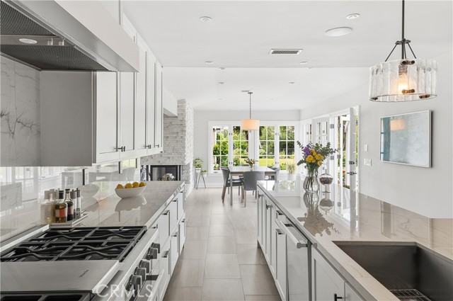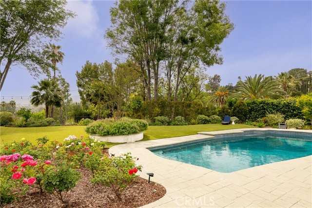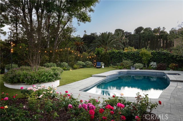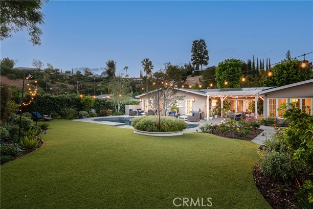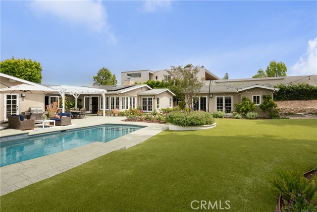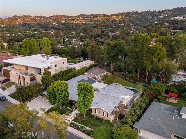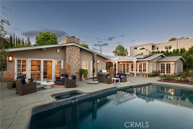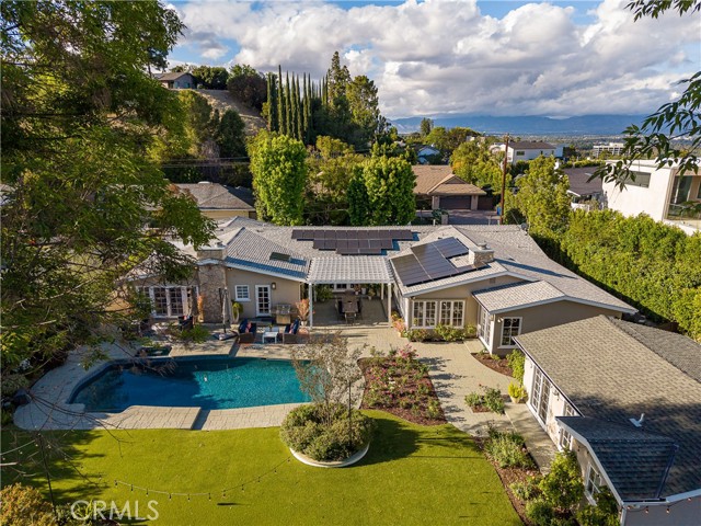 Set on a quiet Encino street, this expansive single-story estate offers approximately 4,600 sq ft including a 584 sq ft detached guest house. Positioned on a rare, flat lot of nearly 18,000 sq ft, the property offers privacy and hillside views. Light-filled interiors feature skylights and French doors that open directly to the backyard, creating a natural connection between indoor and outdoor spaces. Formal living and dining rooms flow into an open kitchen and family room centered around a double-sided fireplace, making the layout especially well suited for both everyday living and entertaining. The kitchen is updated with quartzite waterfall countertops and backsplash, custom cabinetry, a large island, and a full suite of Miele appliances. The primary bedroom suite includes a sitting area, fireplace, and direct outdoor access, along with a spacious bath featuring a soaking tub, dual vanities, and custom closets. Additional bedrooms offer en-suite baths. The backyard is a highlight of the property, private and well laid out, with a pool and spa, grassy yard, pergola-covered patio, and multiple seating areas. The detached guest house offers added flexibility, complete with a kitchenette, its own HVAC, and space well suited for guests, a home office, or extended living. Additional features include a solar system, newly installed roof (2026), dual-zone HVAC, integrated Sonos audio, a monitored security system, and a well-equipped guest house with updated systems. Located just minutes from Ventura Blvd dining and shopping, and close to award winning and highly coveted private and public schools.