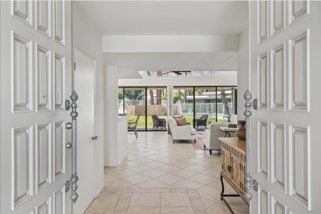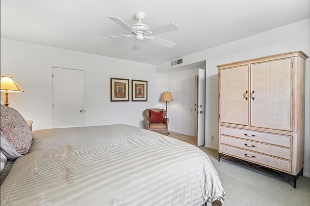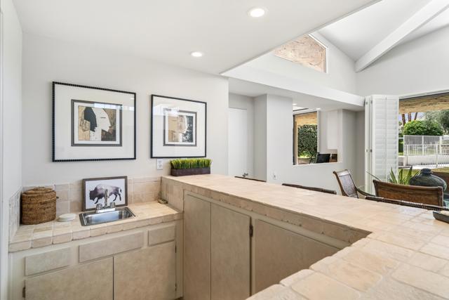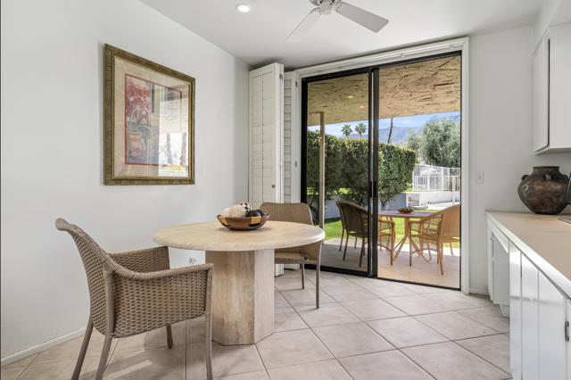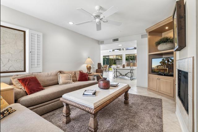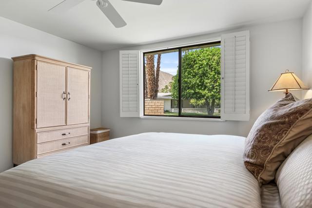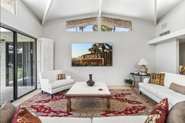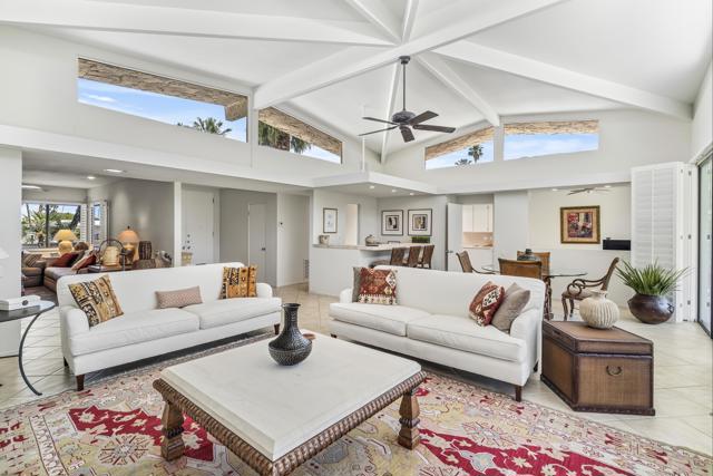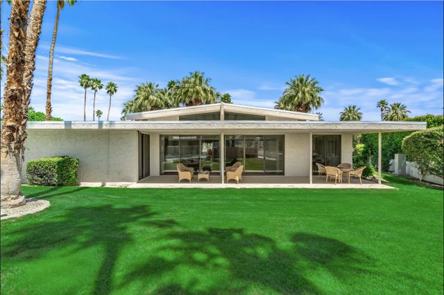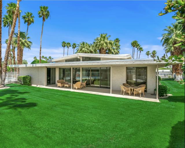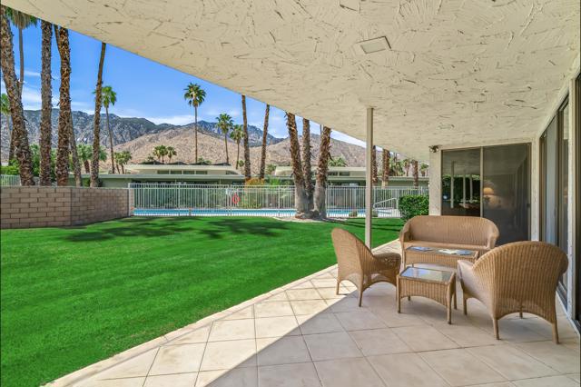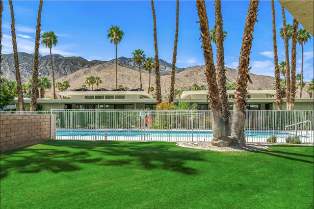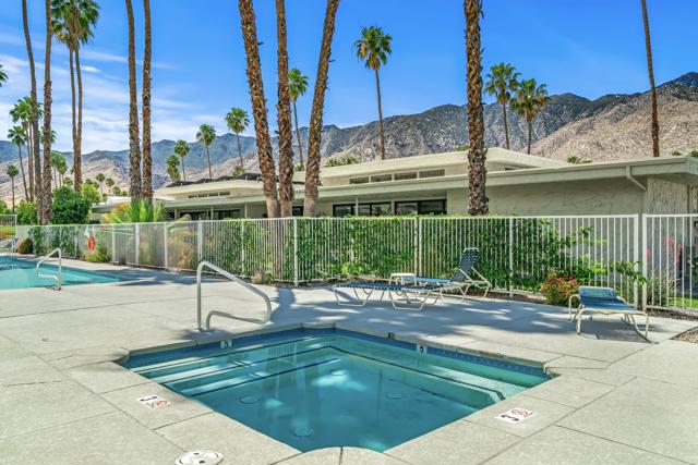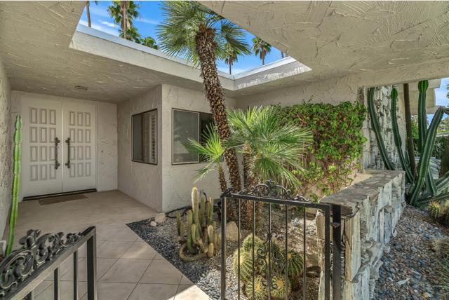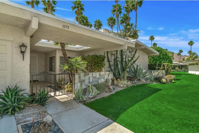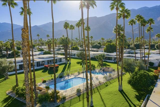 Serving chic mid-century in South Palm Springs' coveted Canyon Estates, this 2,600 sq. ft., 3 bedroom/2.5 bath villa is all about space, style and living your best desert life--with sweeping Mt. San Jacinto views as your backdrop! Step past a private atrium courtyard, through original paneled doors adorned with vintage Regency handles, and into architect Charles Du Bois' signature design--tented ceilings, clerestory windows, and light pouring in from every angle. The original bar, crowned by the architect's signature floating roof is just waiting for your next cocktail hour. Walls of glass open to a large leisure terrace with lush greenbelt and mountain views, plus one of the complex's largest pools just steps away--your own vacation getaway without the crowdsThe kitchen is spacious and inviting, offering abundant cabinetry, generous counter space, and a casual breakfast area, along with a thoughtfully integrated work from home space. The primary suite is a true retreat, featuring multiple closets--including a walk-in--alongside a vanity area and an oversized bathroom adorned with original Mesoamerican-inspired tilework, dual sinks, a soaking tub, and separate shower. Two additional guest rooms are equally well-proportioned, one currently used as a den with a gas fireplace.A newer roof and attached 2 car garage, completes this perfect picture.Life at Canyon Estates is both vibrant and refined. Your HOA fees include cable, Wi-Fi, landscaping, and access to an array of amenities. Meander through lush greenbelts dotted with citrus trees, enjoy 15 pools and 12 spas, or take advantage of tennis, pickleball, and a 9-hole Par 3 executive golf course. The signature clubhouse is a hub for social events and offers a fitness center, library, game room, and a scenic patio overlooking tranquil ponds--creating a true resort-inspired lifestyle in one of Palm Springs' most celebrated communities.
