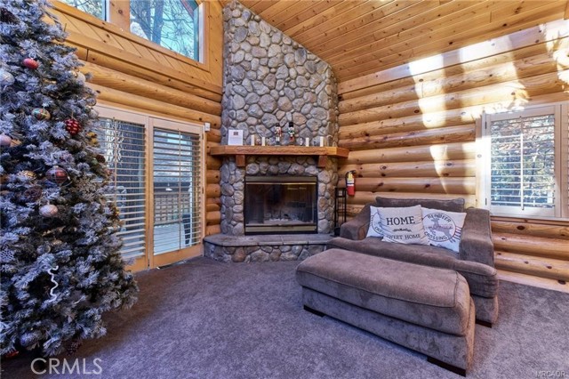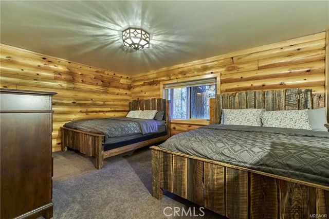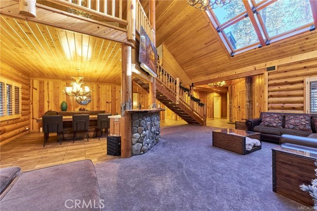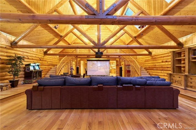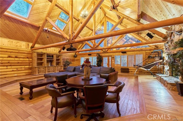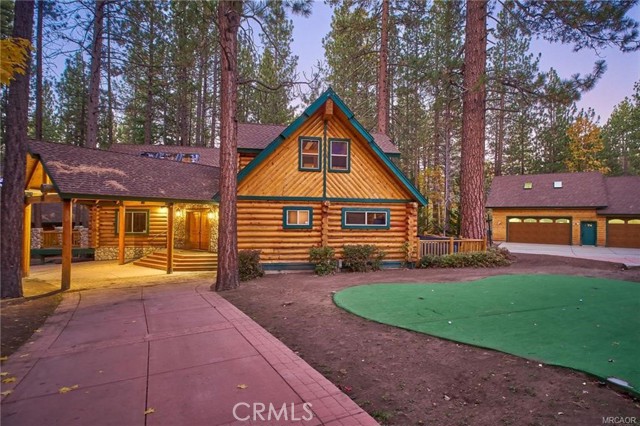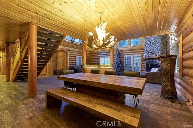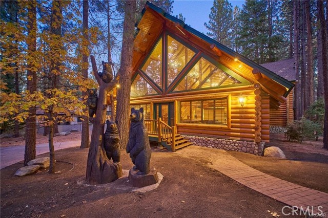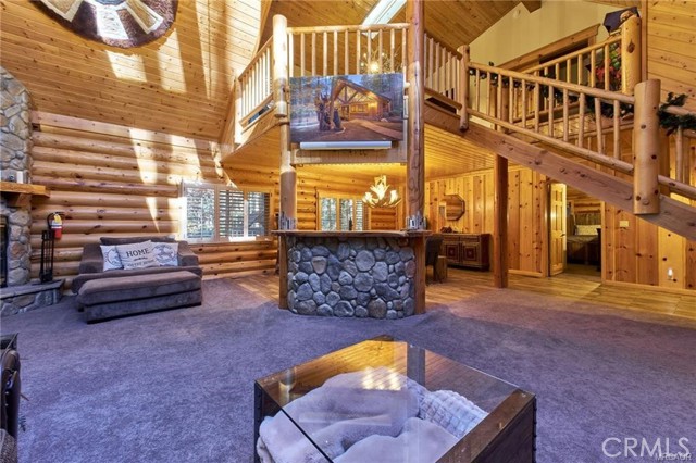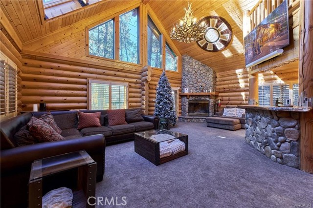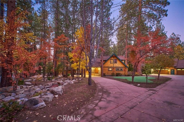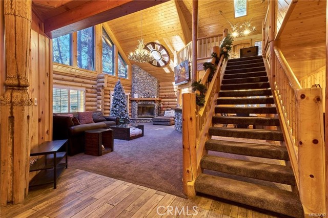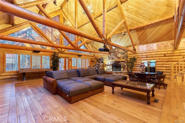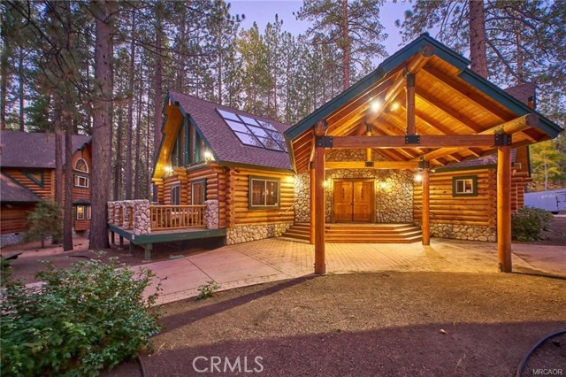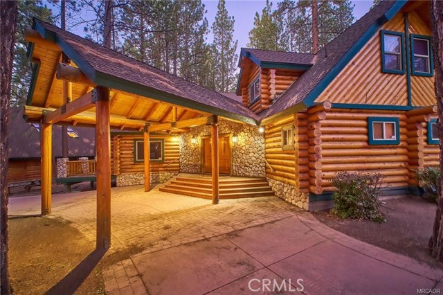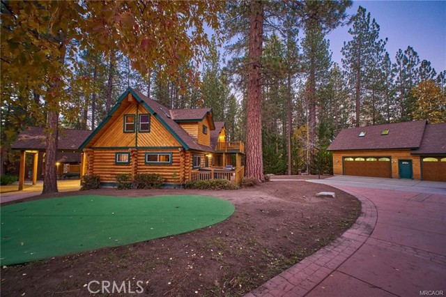 Iconic dual-cabin mountain estate on 1.14 acres with 7,162 sq ft of total living space in one of Big Bear's most desirable neighborhoods. A dual gated entry leads to two beautifully crafted full log-style homes surrounded by lush forest. Cabin One features a porte-cochère, open living and dining area with stone fireplace, wood flooring, and a large kitchen with stainless steel appliances, stone counters, pantry, and laundry. Main level includes two ensuite bedrooms and a guest 1/4 bath. Upstairs offers a huge ensuite primary bedroom with dual vanities, glass shower, stand-alone tub, water closet, and an upper den. Cabin Two showcases a dramatic dual staircase leading to an upper-level ensuite primary with an 8-person jacuzzi, walk-in shower, dual vanities, and water closet. Main level includes an additional ensuite bedroom, a spacious great room with stone fireplace, and formal dining. Kitchen with stainless appliances, stone counters, pantry, and laundry room. Exterior amenities , lush landscaping, five entertainment decks, a three-hole putting green, and an oversized garage previously used as a training facility for professional fighters . A rare mountain compound offering luxury, space, and a true escape and variety of possible uses.