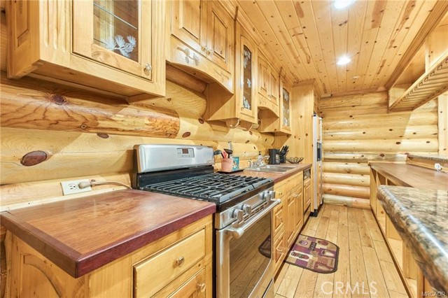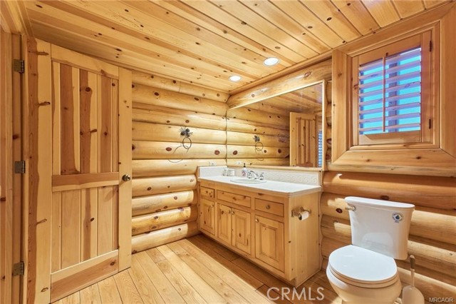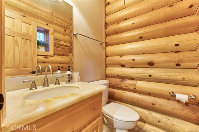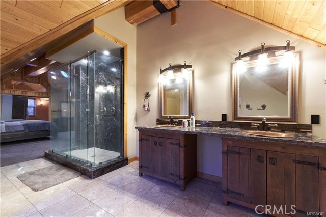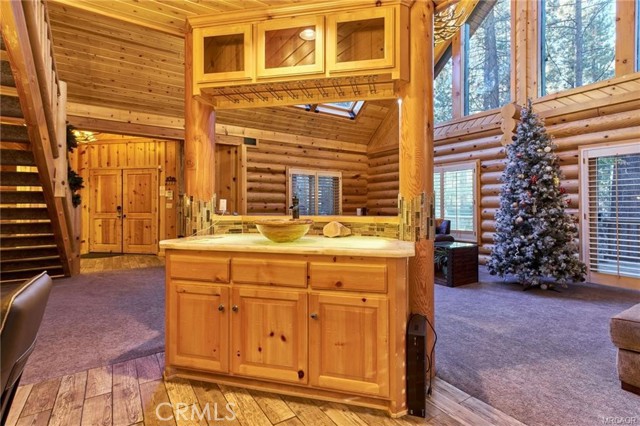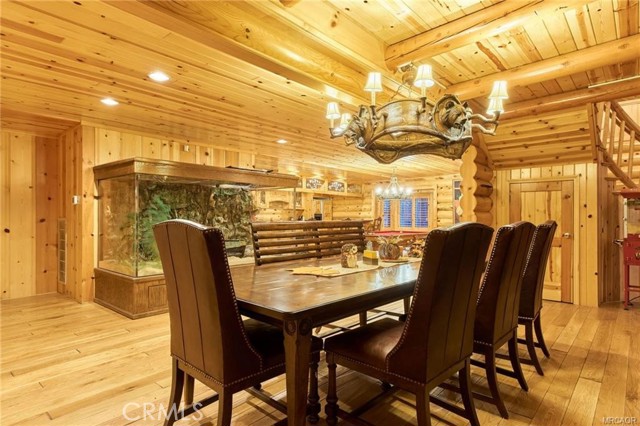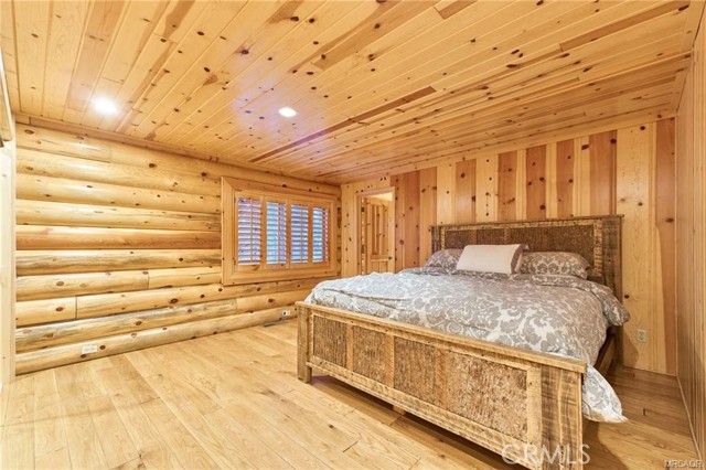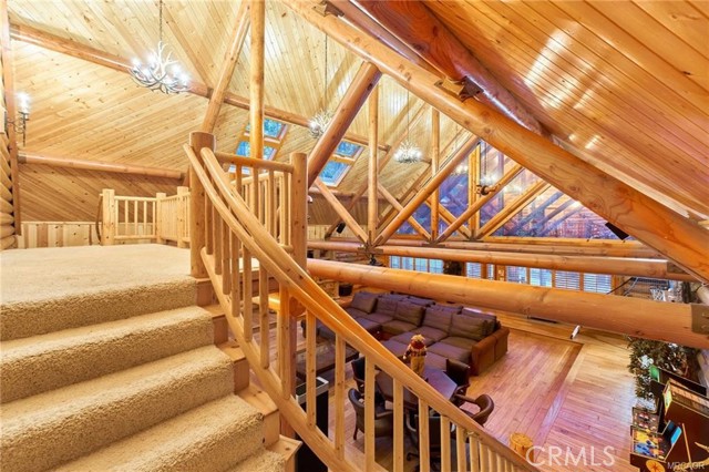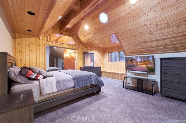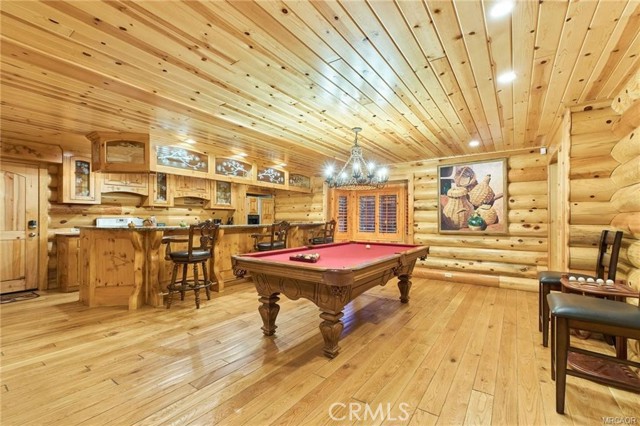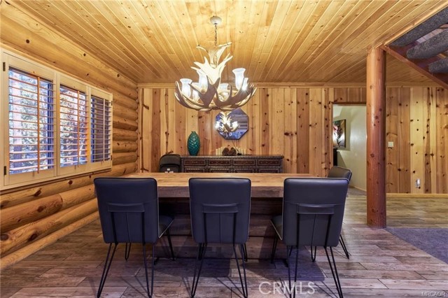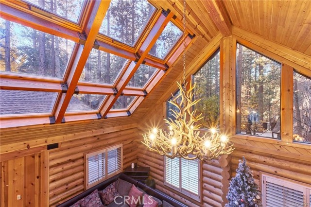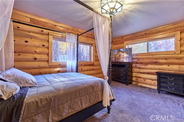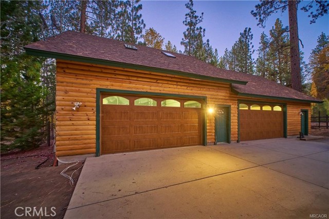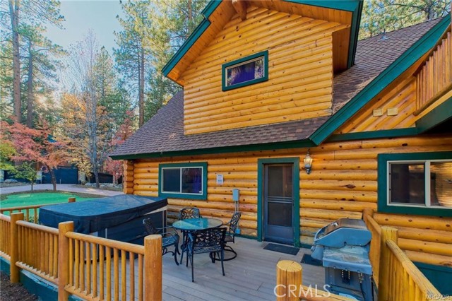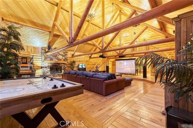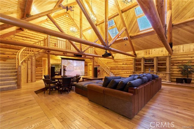 Iconic dual-cabin mountain estate on 1.14 acres with 7,162 sq ft of total living space in one of Big Bear's most desirable neighborhoods. A dual gated entry leads to two beautifully crafted full log-style homes surrounded by lush forest. Cabin One features a porte-cochère, open living and dining area with stone fireplace, wood flooring, and a large kitchen with stainless steel appliances, stone counters, pantry, and laundry. Main level includes two ensuite bedrooms and a guest 1/4 bath. Upstairs offers a huge ensuite primary bedroom with dual vanities, glass shower, stand-alone tub, water closet, and an upper den. Cabin Two showcases a dramatic dual staircase leading to an upper-level ensuite primary with an 8-person jacuzzi, walk-in shower, dual vanities, and water closet. Main level includes an additional ensuite bedroom, a spacious great room with stone fireplace, and formal dining. Kitchen with stainless appliances, stone counters, pantry, and laundry room. Exterior amenities , lush landscaping, five entertainment decks, a three-hole putting green, and an oversized garage previously used as a training facility for professional fighters . A rare mountain compound offering luxury, space, and a true escape and variety of possible uses.