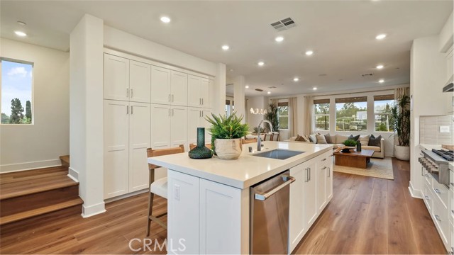 A turnkey, modern transitional three-story Hazel Residence 3 townhome featuring 3 bedrooms, 2 full & 2 half baths, and attached two-bay garage. The first floor includes a flexible office or den, ideal for remote work or additional living space. Designer selected upgraded flooring The open-concept main level showcases a spacious kitchen with a large island that flows seamlessly into the living and dining areas. The kitchen is appointed with stainless steel GE appliances, including a refrigerator, a 6-burner gas cooktop with a professional hood, an undermount stainless steel sink, soft-close drawers, and elegant quartz countertops.