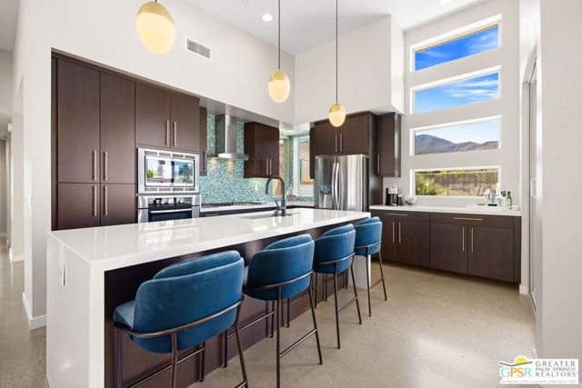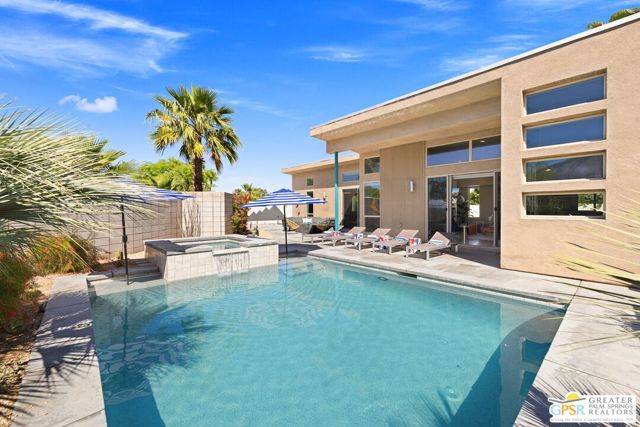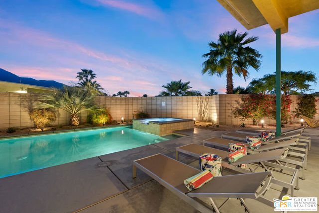 Big views. Bold style. A standout Murano residence positioned at the end of a cul de sac delivers the kind of Palm Springs living people come here for, with excellent short term rental flexibility for investors and part time use. Set on an oversized lot with mountain views, this west facing property pairs clean modern lines with a resort style setting. Vaulted ceilings and polished concrete floors frame a huge open living space anchored by a floating linear fireplace. Expansive glass doors open to the outdoors, creating an easy indoor outdoor connection. The kitchen is a showstopper with an XL quartz waterfall island, bar seating, specialty lighting, and a premium appliance suite including Bosch. The layout offers great separation with two primary suites, including a main retreat that opens to the backyard with a spa style bath featuring soaking tub, walk in shower, dual vanities, and a custom walk in closet, while a third bedroom adds flexibility. Outdoors, the ultra private backyard shines with a heated PebbleTec saltwater pool and spa, piped natural gas fire pit, and outdoor dining under string lights, plus a regulation size bocce court and private pickleball court alongside citrus trees including Pomelo and Meyer lemon. Owned solar with 16 panels, tankless water heater, solar shades, 2 zone HVAC, and a 220 volt EV charging station enhance efficiency. Attached two car garage. NO HOA FEES and Fee Land you own.
